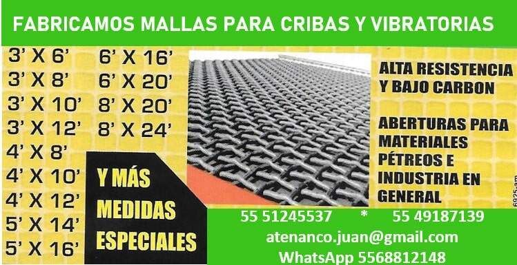 - Para cribas vibratorias .3’X6’, 3’X8’, 3’X10’, 4’X12’, 4’X16’5’X10’, 5’X12’, 5’X14’, 5’X16’, 6’X16’6’X18’, 6’X24’